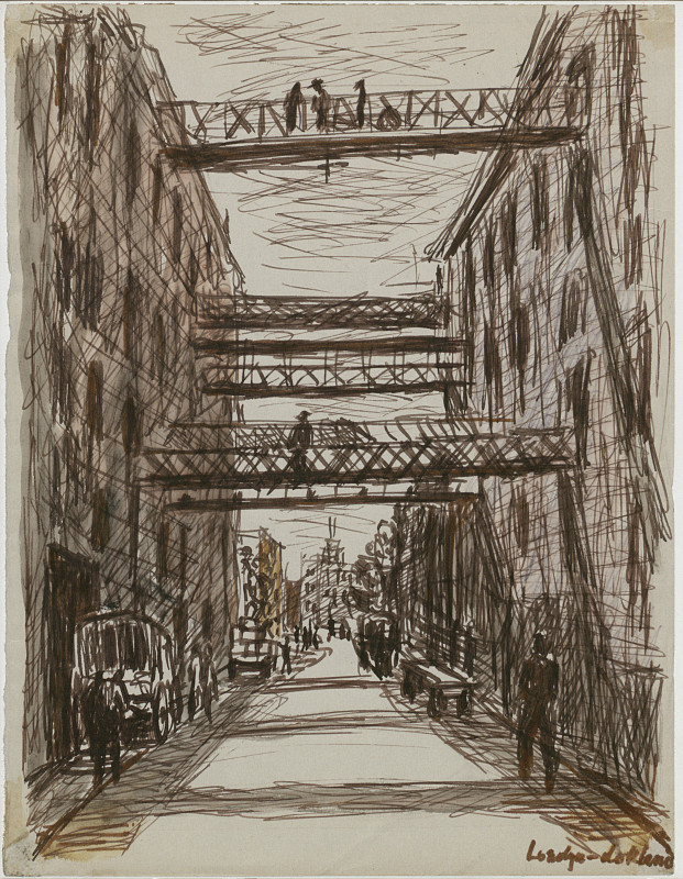 „Składy towarowe w porcie londyńskim”, 1952<br>tusz i lawowanie na papierze<br>(Wł. MUT)