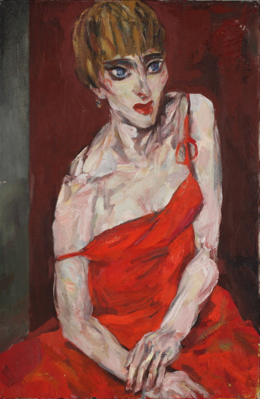 „Woman in red dress”, 1983<br>olej na płótnie<br>76 x 51 cm<br>(Wł. MUT)