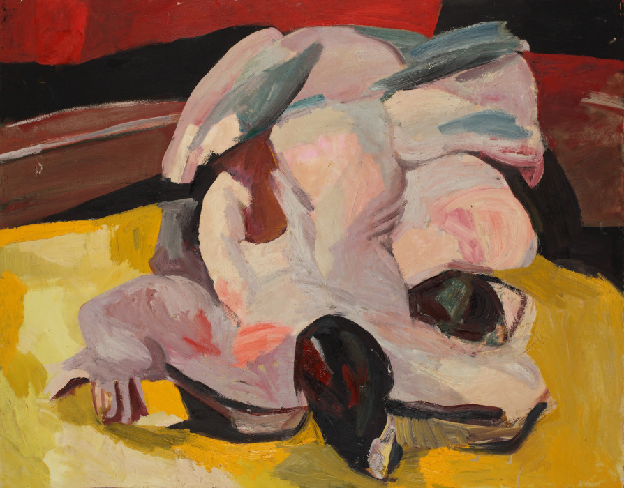 „Wrestlers on yellow floor”, 1965-1995<br>olej na płycie pilśniowej<br>94,5 x 122 cm<br>(Wł. MUT)